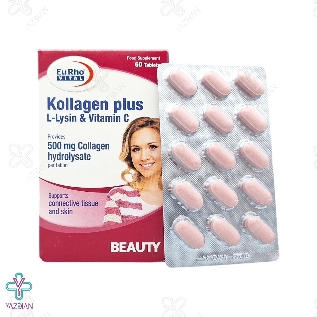 قرص کلاژن پلاس ال لیزین و ویتامین ث یوروویتال (EuRhoVital Kollagen Plus L Liysin And Vitamin C 60 Tablets) با دارا بودن کلاژن هیدرولیزات، ال لیزین و ویتامین C در ترکیبات خود می تواند تولید کلاژن در پوست را افزایش داده و ضمن حفظ و بهبود سلامت پوست و بافت های پیوندی، باعث کاهش چین و چروک های پوست شود و همچنین خاصیت کشسانی آن را ارتقا بخشد.