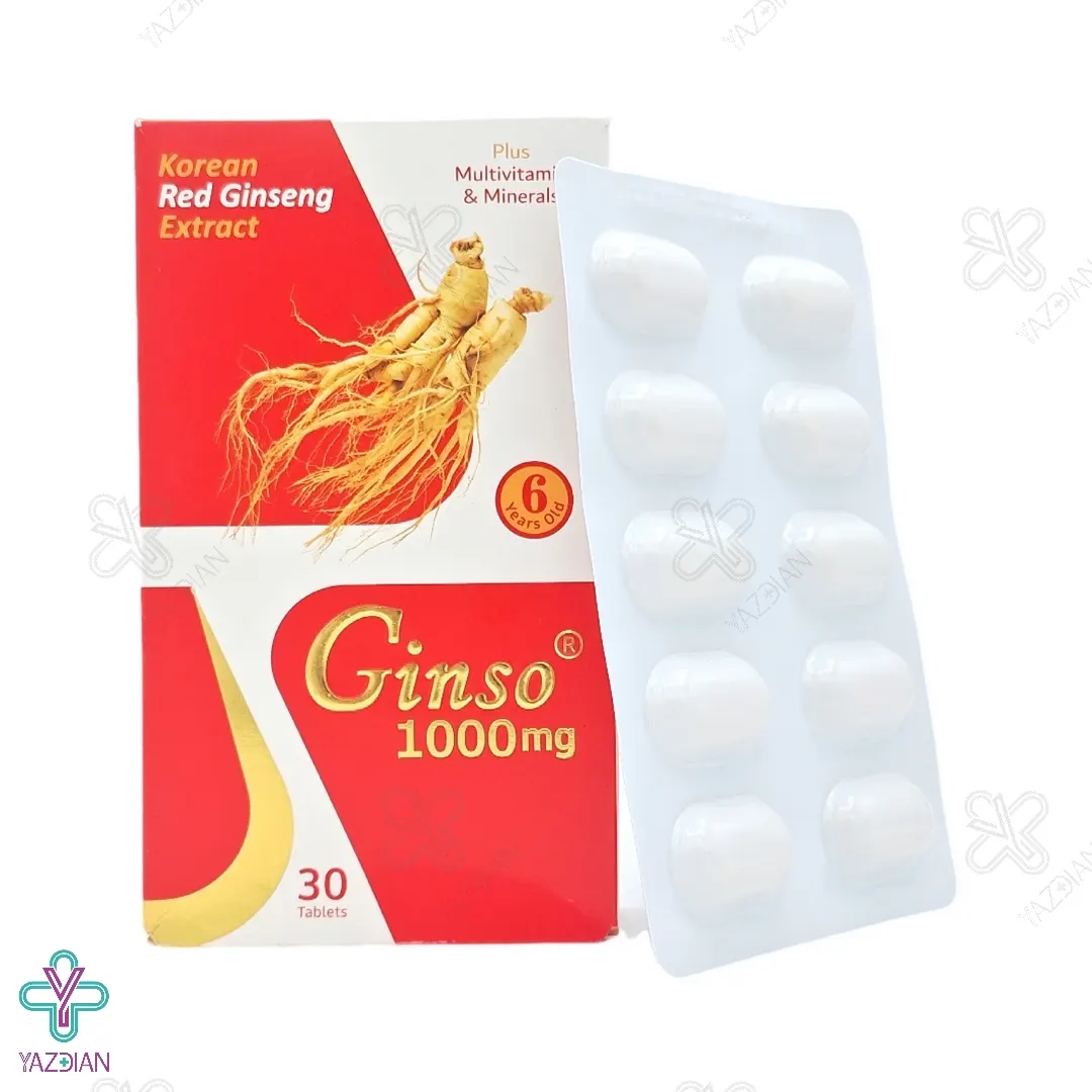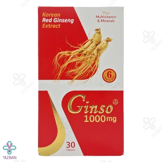 قرص رد جینسینگ 1000 میلی گرم جینسو (Red ginseng tablets 1000 mg ginso ) خستگی و ضعف و عدم تمرکز را رفع و سبب تقویت شادی و نشاط می شود. این محصول هم چنین هوشیاری ذهن را حفظ و سبب تقویت سیستم ایمنی بدن می شود.
