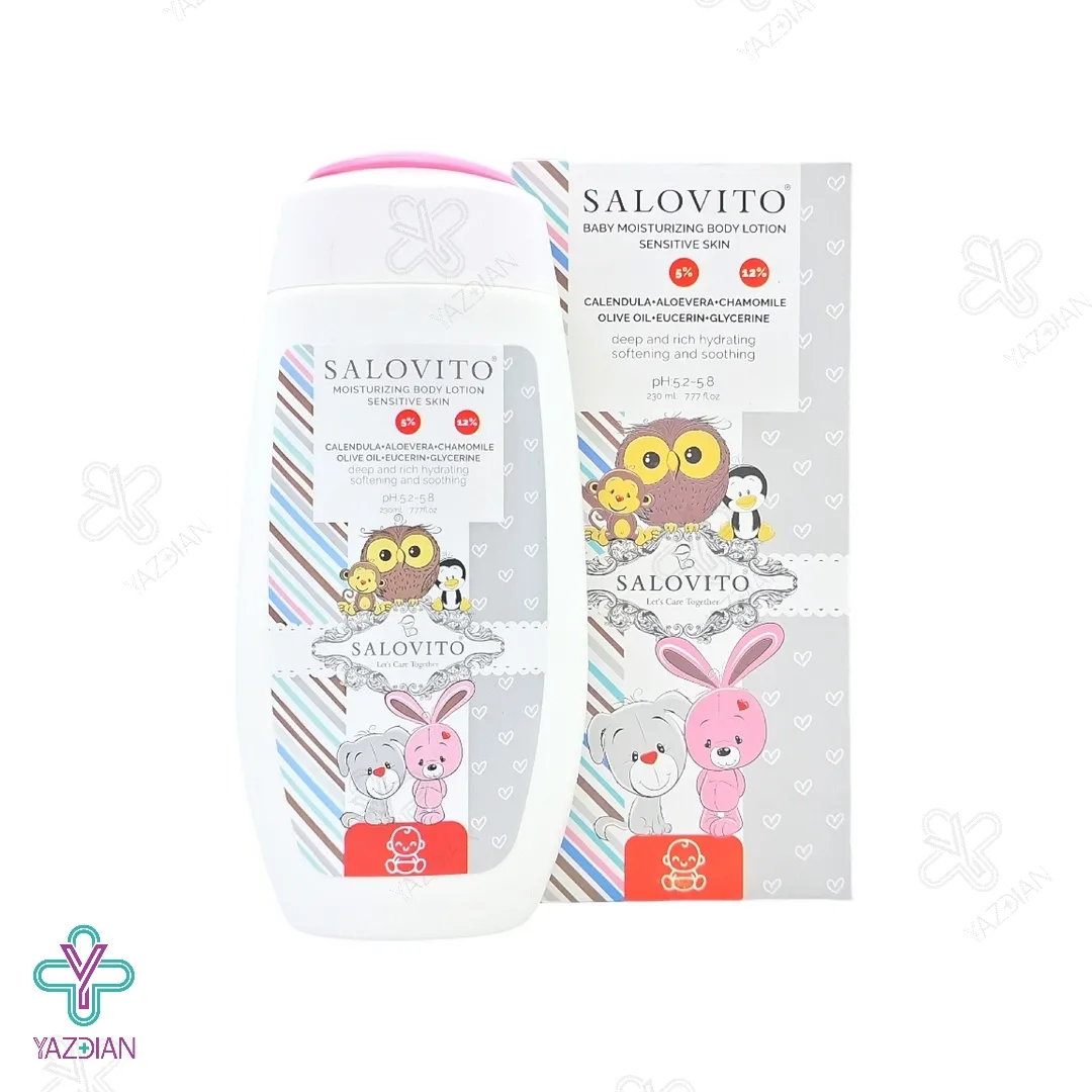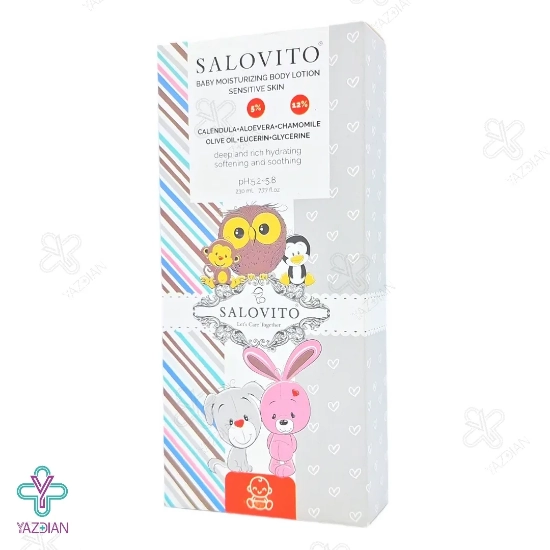 لوسیون مرطوب کننده سالوویتو حاوی 5 درصد آلوئه ورا مناسب کودکان زیر یکسال (Salovito Baby Moisturizing Body Lotion Sensetive Skin 230 ml) با دارا بودن عصاره های گیاهی ارزشمند نظیر آلوئه ورا، بابونه، کالاندولا، روغن زیتون و مواد مؤثر اوسرین و گلیسیرین در فرمولاسیون خود می تواند ضمن آبرسانی و رطوبت رسانی مناسب، مانع از خشکی و ترک خوردگی پوست کودکان شده و نرمی، لطافت و شادابی پوست آنان را افزایش دهد.