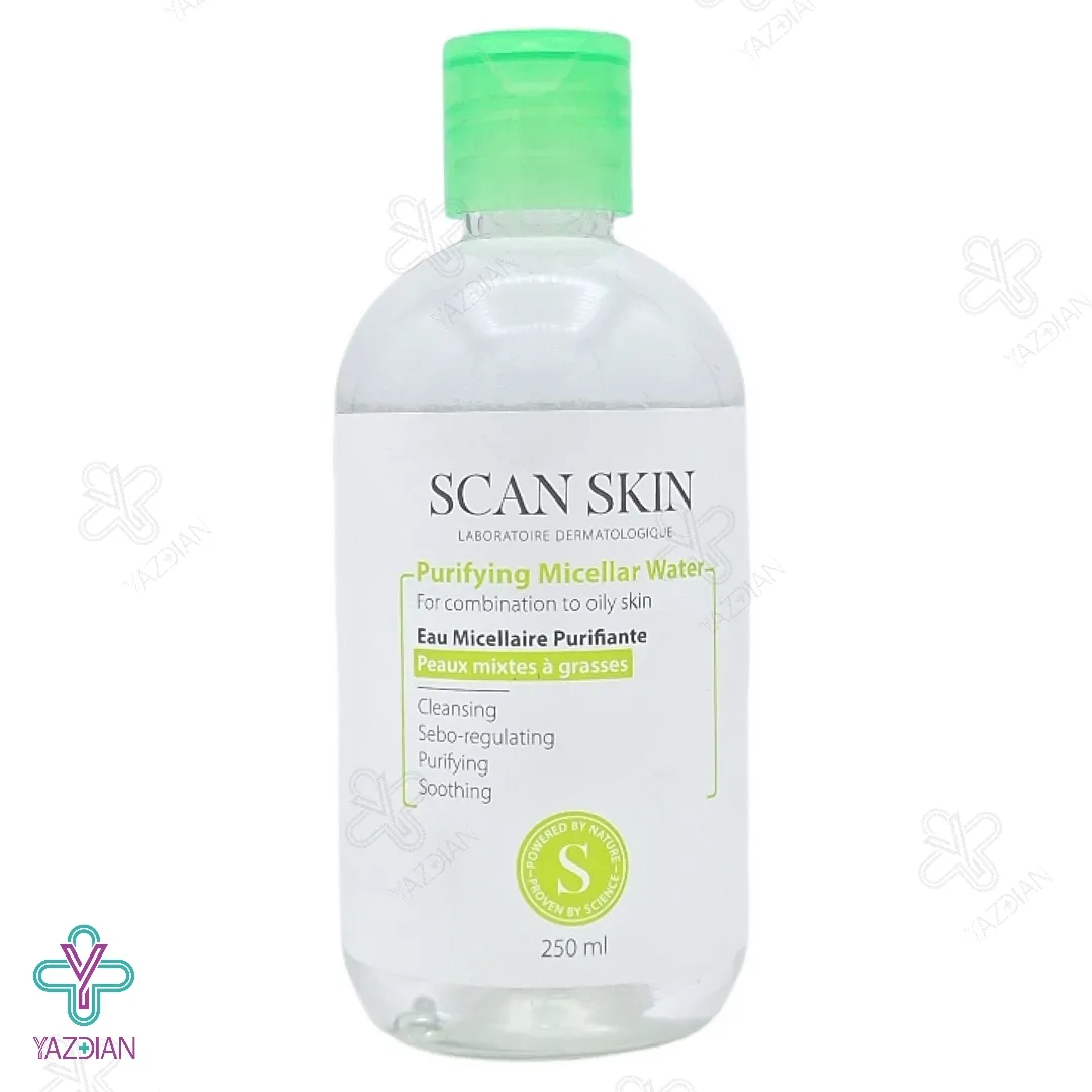 محلول پاک کننده میسلار واتر پوست چرب اسکن اسکین (Scan Skin Purifying Micellar Water Oily Skin 250 ml) آلودگی های پوست را بدون به وجود آمدن خشکی و احساس کشش پاک می کند. یکی دیگر از ویژگی های این محصول این است که پس از استفاده از آن دیگر نیازی به شست و شو و مصرف تونر برای ایجاد تعادل در PH پوست نیست. این محلول میزان تولید چربی در پوست را تنظیم کرده و به دلیل داشتن خواص آنتی باکتریالی از به وجود آمدن آکنه بر روی پوست پیشگیری می کند. محلول پاک کننده ی اسکن اسکین تحریکات پوستی را التیام بخشیده و هم چنین از به وجود آمدن التهاب نیز پیشگیری می کند.