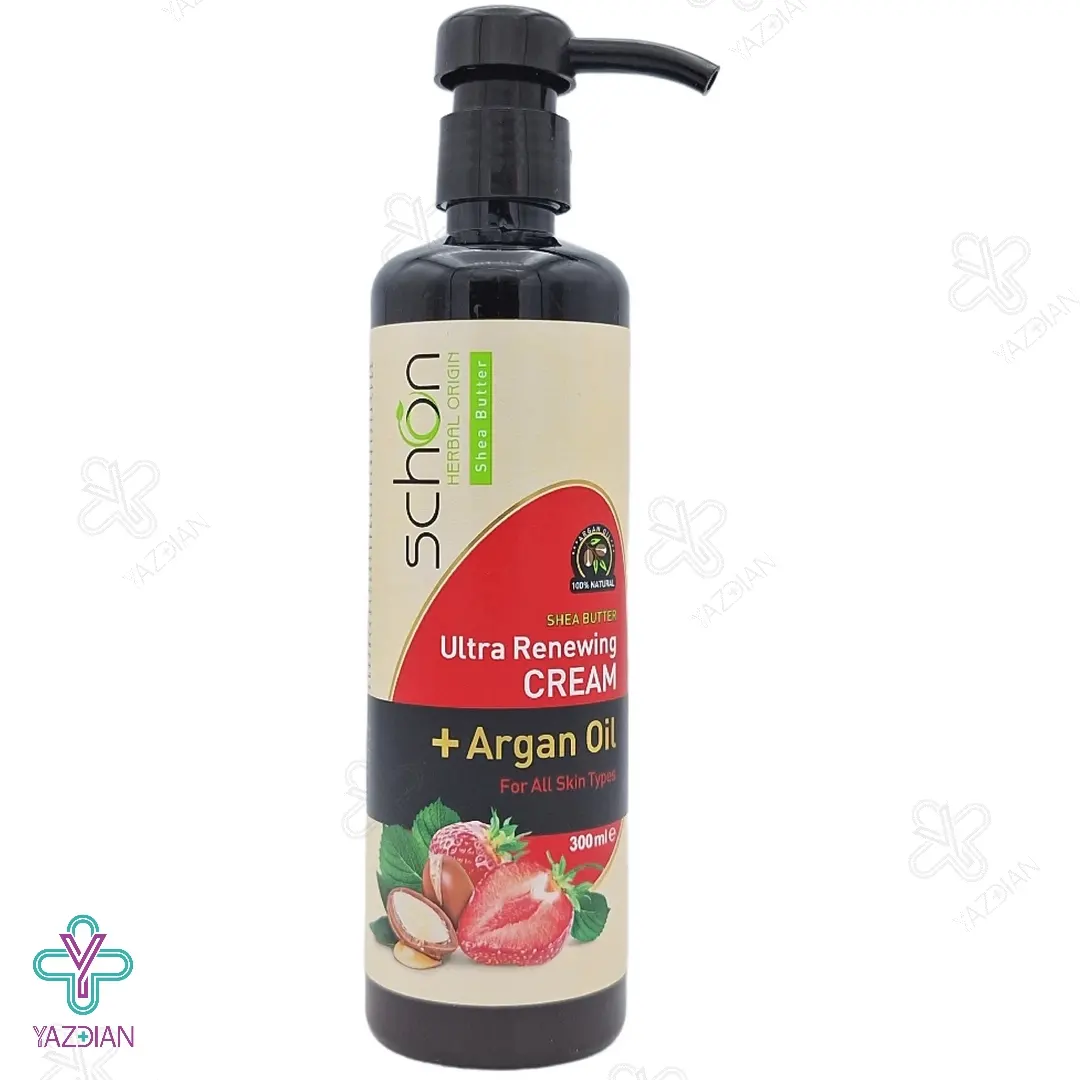 کرم مرطوب کننده آرگان و توت فرنگی پمپی شون (Schon Strawberry Argan Ultra Renewing Cream 300 ml) باعث آب رسانی و مرطوب شدن پوست می شود.