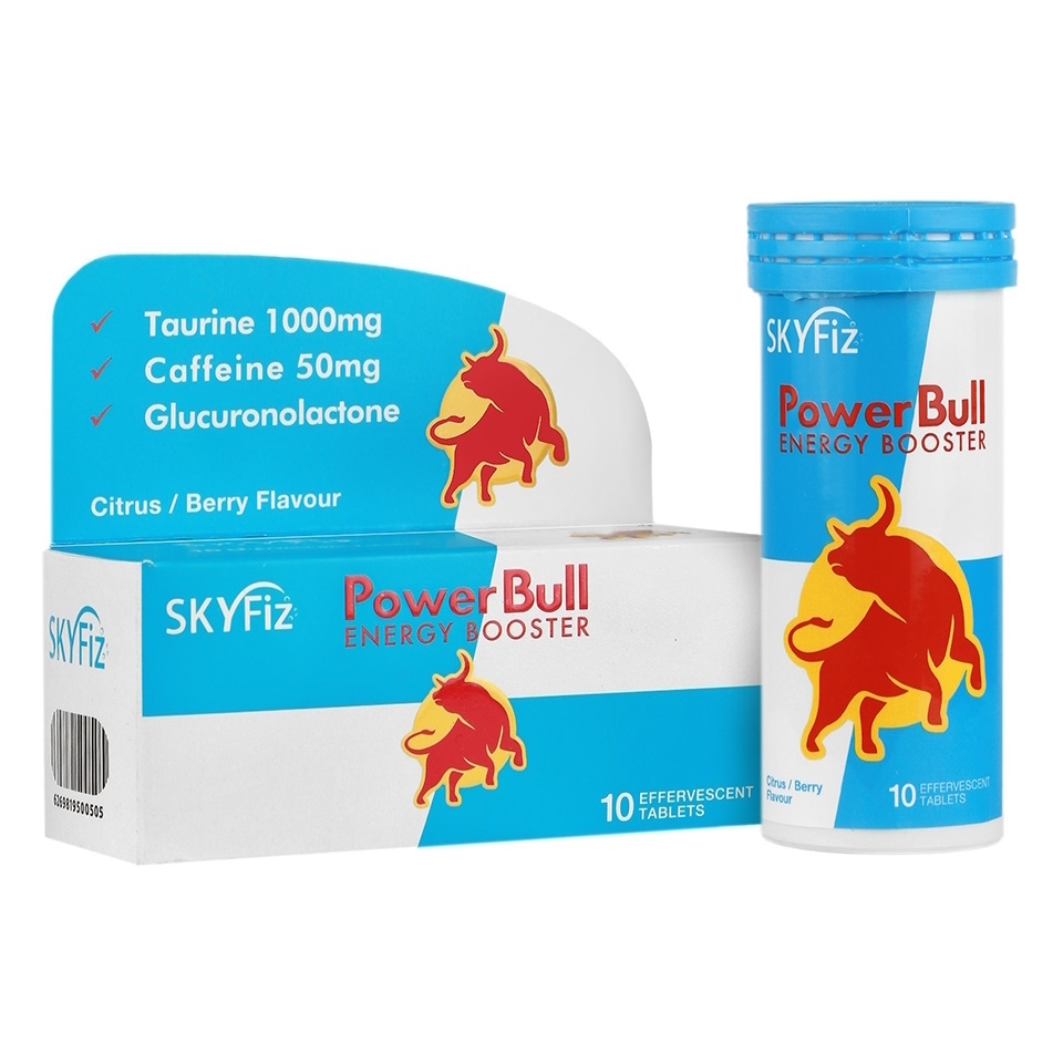 قرص جوشان انرژی زا پاور بول اسکای فیز (skyfiz power bull energy booster effervescent tablets – 10 pcs) دارای ترکیبات موثری است که موجب افزایش انرژی می شود و برای افرادی که در طول روز فعالیت دارند یک محصول بسیار موثر و کارآمد می باشد این محصول با فرمولاسیون منحصر به فردی که دارد موجب تامین سریع انرژی شده و در فعالیت هایی مانند صبح های زود، سخنرانی های مهم، سفرهای طولانی، برای مطالعه آخر شب و خستگی های بعد از ظهر بسیار موثر می باشد تائورین موجود در این محصول موجب تنظیم عملکردهای عصبی و ماهیچه ای شده و فعالیت های مغز و قلب را تقویت می کند و هم چنین دارای خاصیت آنتی اکسیدانی بوده و اثرات مخرب رادیکال های آزاد بر بدن را خنثی می کند کافئین نیز در این محصول موجود می باشد که موجب افزایش سطح آدرنالین در زمان فعالیت شده و موجب بهبود و تمرکز و هوشیاری ذهنی می شود گلوکورونولاکتون موجود در این محصول موجب سم زدایی در بدن شده و انرژی را افزایش داده و خستگی را کاهش می دهد جینسینگ نیز در این محصول موجود می باشد که موجب افزایش انرژی و کاهش خستگی شده و موجب تحریک آدنوزین تری فسفات شده که منبع اولیه برای سلول ها می باشد.