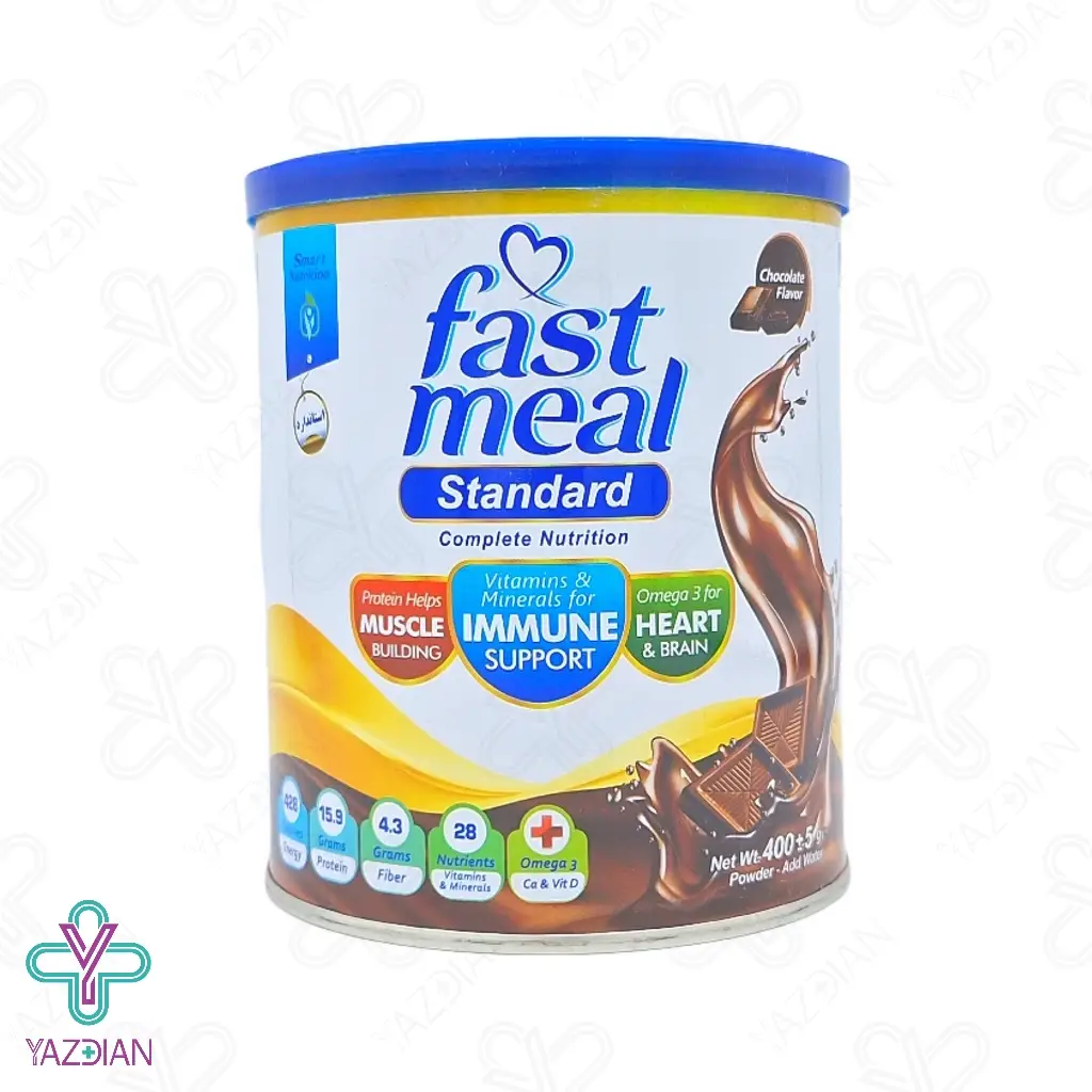 پودر فست میل استاندارد شکلاتی اسمارت نوتریشن - 400 گرم (Smart Nutrition Fast Meal Standard) از دسته مکمل های رژیمی غذایی سالمندان و بیماران می باشد که یک جایگزین عالی جهت تامین مواد مغذی و انرژی روزانه بدن می باشد. این محصول قابل مصرف به صورت خوراکی و گاواژ و یا به عنوان مکمل بین وعده های غذایی و حتی به صورت نوشیدنی به همراه غذا می باشد. بهره گیری از پروبیوتیک ها در این مکمل سبب شده است تا باکتری های مفید دستگاه گوارش تنظیم شوند و سلامت دستگاه گوارش حفظ شود.