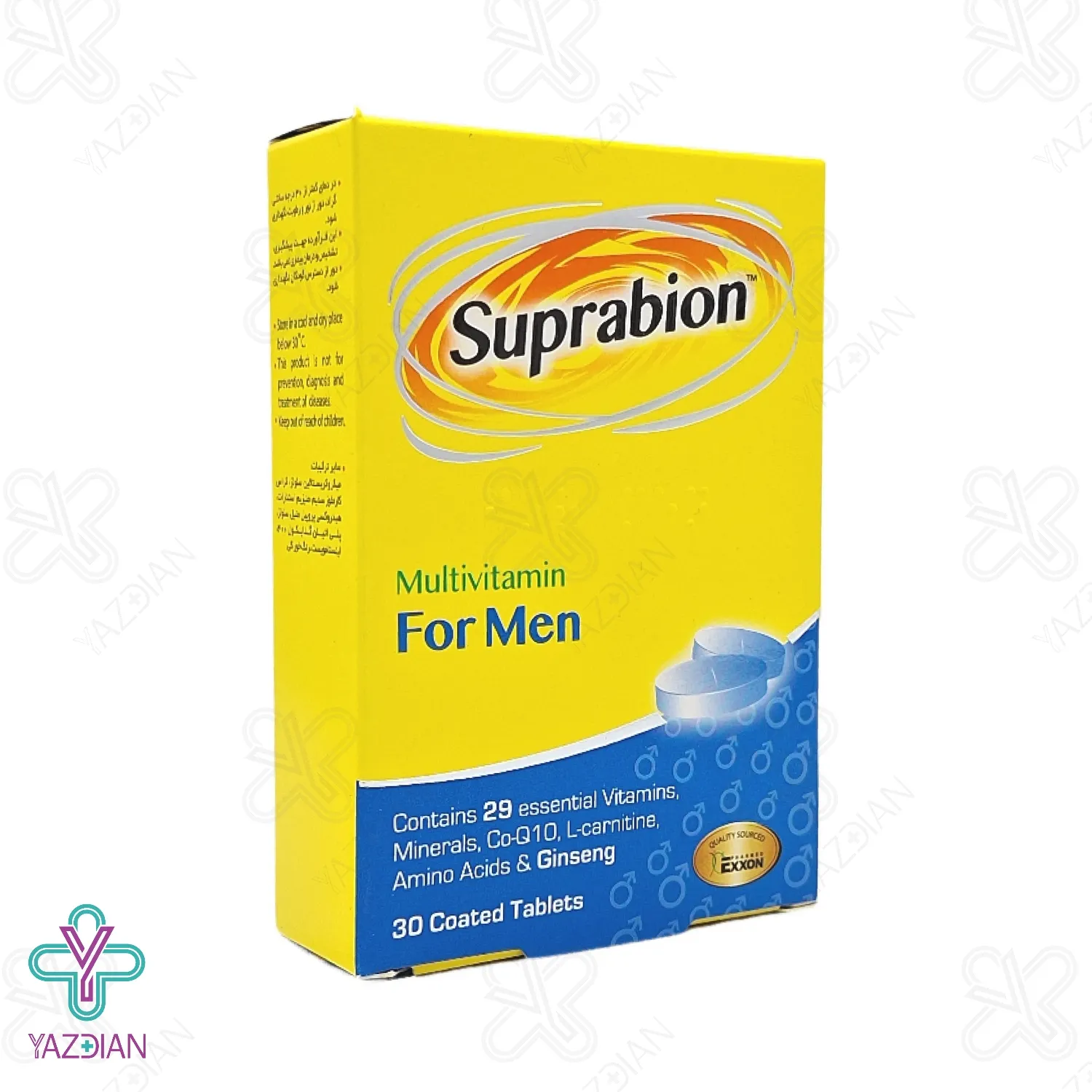 قرص سوپرابیون آقایان (Suprabion Multivitamin Mineral For Men 30 Tabs) به منظور تأمین نمودن ویتامین ها و مواد معدنی مورد نیاز آقایان تولید شده است و می تواند در جهت تقویت قوای جنسی مردان نیز موثر باشد.