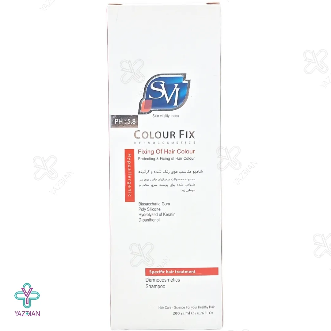 شامپو کالر فیکس اس وی آی مناسب موهای رنگ شده و کراتینه (SVI Colour Fix Shampoo 200 ml) با دارا بودن کراتین، ویتامین B5 و دیگر ترکیبات مؤثر و مفید موجود در فرمولاسیون خود می تواند بر روی موها لایه ای محافظتی ایجاد کرده و ضمن احیا و تثبیت نمودن رنگ موها، باعث ترمیم و بازسازی بافت های مو شود؛ همچنین نرمی، درخشندگی و حالت پذیری موها را افزایش دهد.