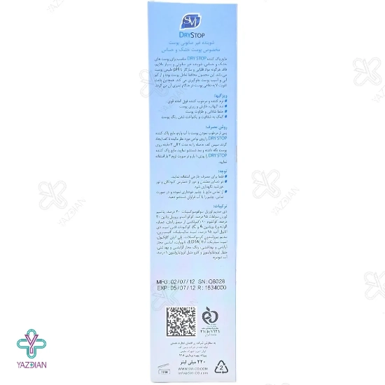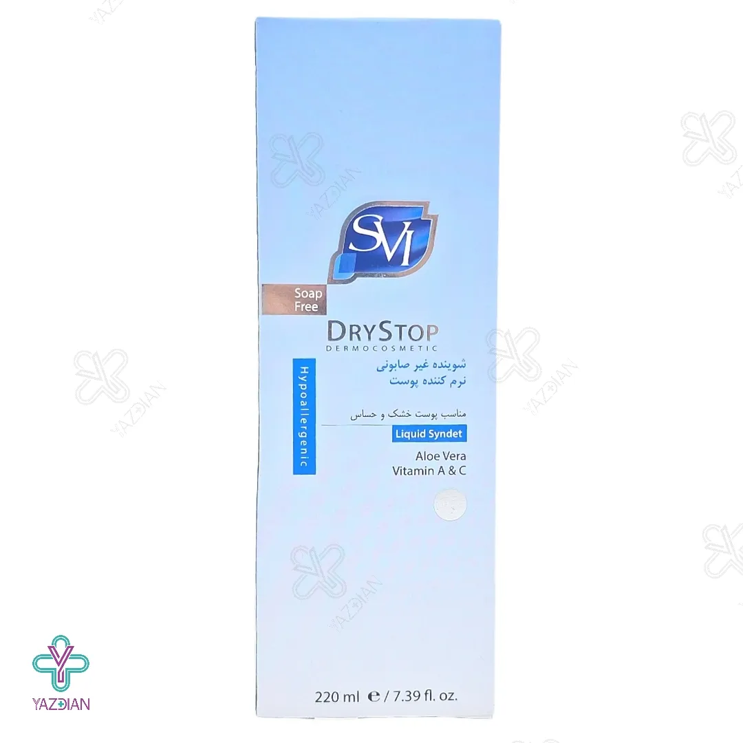 پن مایع غیر صابونی درای استاپ پوست خشک اس وی آی (SVI Dry Stop Liquid Cleaning for Dry and Sensitive Skin 220 ml) یک محصول شستشو و پاک کننده مناسب برای شستن پوست های خشک و حساس است. این محصول یک پاک کننده ی ملایم و غیر صابونی بوده و در آن مواد قلیایی به کار نرفته و به همین دلیل با PH طبیعی پوست سازگار است. یکی دیگر از ویژگی های این پن مایع این است که مانع از کم آبی و آسیب به پوست شده و علاوه بر حفظ تعادل آن در هنگام تمیزی سبب تقویت لایه ی دفاعی پوست می شود.