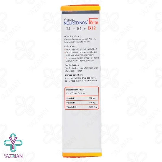 قرص نوروبیون نورودینون فورت ویتال (Vitawell Neurodinon Forte 30 F.C Tablets) یک مکمل رژیمی غذایی ویژه و غنی ویتامین های گروه ب از جمله B۱، B۶ و B۱۲ می باشد که در صورت کمبود این ویتامین ها عوارض خطرناکی برای بدن خواهد داشت. این قرص قادر است تا عملکرد سیستم عصبی را بهبود بخشد و در ساخت طبیعی گلبول های قرمز نیز موثر است. بعلاوه سیستم ایمنی بدن را تقویت کرده و میزان انرژی تولیدی را در بدن بالا می برد. قرص نوروبیون نورودینون کرامپ های قاعدگی بانوان جوان را کاهش داده و در روند درمان کم خونی ناشی از ویتامین ب12یا همان کم خونی مگالوبلاستیک موثر است.