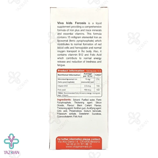 شربت آهن لیپوزومال فروسیس ویواکیدز (Viva Kids Ferosis Liposomal Liquid 200 ml) با دارا بودن آهن از نوع لیپوزومال در فرمولاسیون خود می تواند آهن و فاکتورهای ساخت هموگلوبین را تأمین کرده و بدین گونه از کم خونی مؤثره از فقر آهن پیشگیری نماید. این فرآورده برای کودکان در سنین رشد و افراد بزرگسال قابل مصرف می باشد.