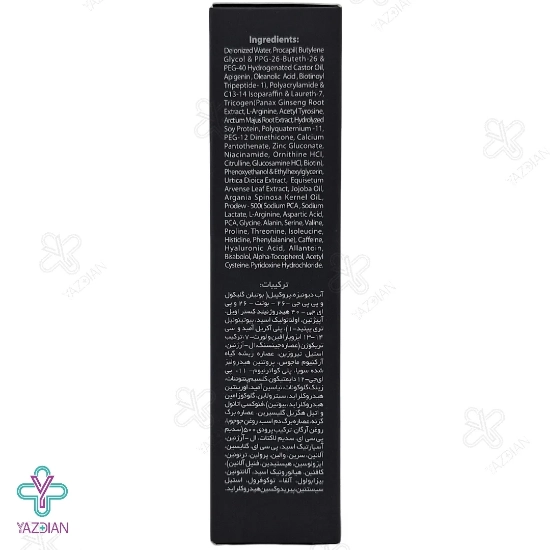 پیریدوکسین هیدروکلراید، آب دیونیزه، استیل سیستئین، پروکپیل (بوتیلن گلیکول و پی پی جی-26-بوتت-26 و پی ای جی-40 هیدروژنیتد کستر اویل، آپیژنین، اولئانولیک اسید، بیوتینوئیل تری پپتید-1)، آلفا=توکوفرول، پلی آکریل آمید و سی 13-14 ایزوپارافین و لورت-7 ترکیب تریکوژن (عصاره جینسینگ، ال- آرژنین، استیل تیروزین، عصاره ریشه گیاه آرکتیوم-11، پی ای جی-12 دایمتیکون، کلسیم، پنتوتئات، زینک گلوکونات، نیاسین آمید، اورینتین هیدروکلراید، سیترولاین، گلوکوزامین هیدروکلراید، بیوتین)، بیزابولول، کافئین، آلانتوئین، هیالورونیک اسید.