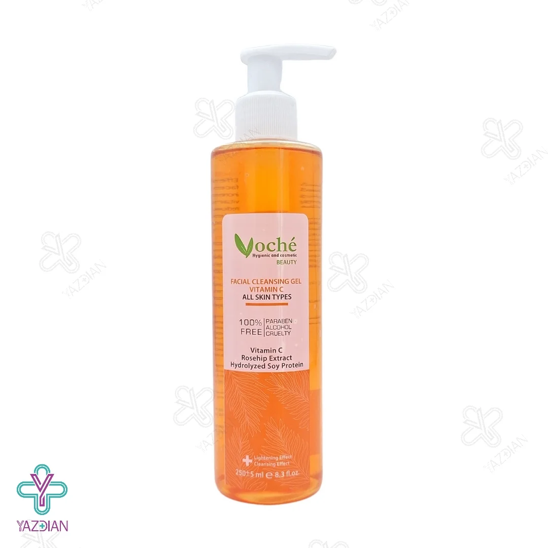 ژل شستشوی صورت ویتامین ث وچه (Voche Facial Cleansing Vitamin C Gel 250 ml) با بهره گیری از ترکیبات مؤثر و گیاهی نظیر عصاره رزهیپ، گیاه زیتون و سویا به همراه ویتامین C در فرمولاسیون خود می تواند مواد آرایشی و دیگر آلودگی های محیطی را به خوبی از روی پوست پاکسازی نماید و ضمن محافظت از رطوبت طبیعی پوست و جلوگیری از ایجاد خشکی و کشیدگی در آن، باعث افزایش روشنی و شفافیت پوست شود.