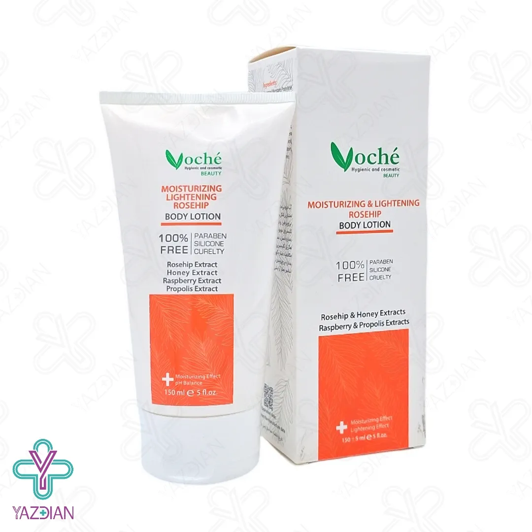 لوسیون مرطوب کننده و شفاف کننده رزهیپ وچه - 150 میلی لیتر (Voche Rosehip Moisturizing Body Lotion ۱۵۰ ml) ساخت شرکت محبوب توسعه کسر آسیا در کشور عزیزمان ایران می باشد که بدلیل بافت بسیار سبکی که دارد، به آسانی روی پوست پخش می شود و روی پوست سنگینی نمی کند.