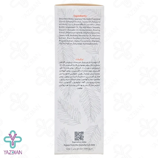 استئاریک اسید، بیزابولول، روغن ماکادمیا، آب دیونیزه، ایزوپروپیل میریستات، پروپیلن گلایکول ستئاریل الکل، روغن جوجوبا، پلی اکریل آمید و سی ۱۳-۱۴، فنوکسی اتانول و اتیل هگزیل گیلیسیرین، عصاره آلوئه ورا، ایزو پارافین و لورت۷، شی باتر، روغن هسته انگور، گلیسرول مونو استئارات، گلیسیرین، روغن آووکادو، عصاره عسل، عصاره رزهیپ، عصاره تمشک سیاه، دکسپانتنول، عصاره پروپولیس، توکوفریل استات آلانتوئین، ادتا، اسانس مجاز آرایشی و بهداشتی بوتیلیتد هیدروکسی تولئون.